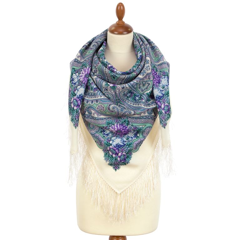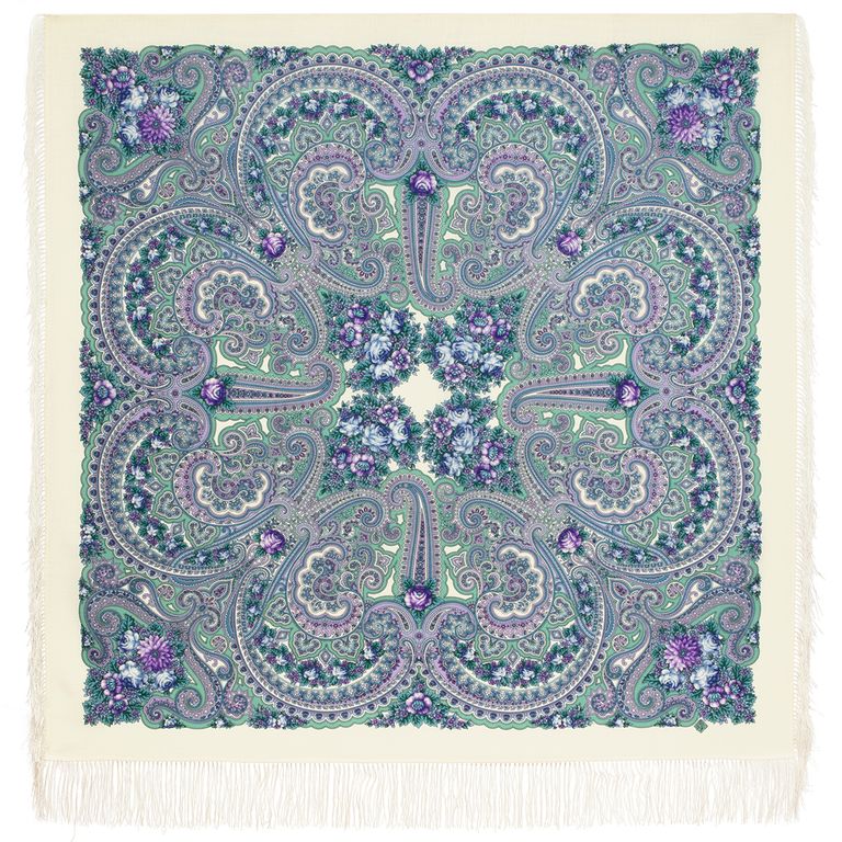 Павловопосадский шерстяной платок с шелковой бахромой "Летний хоровод" арт. 2034-0