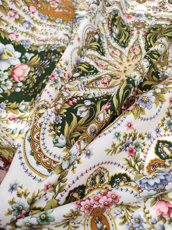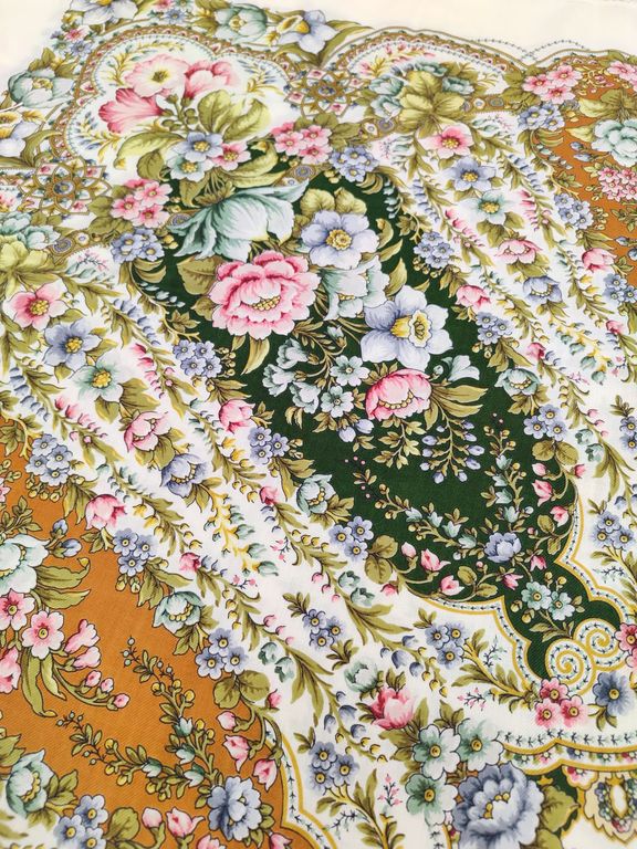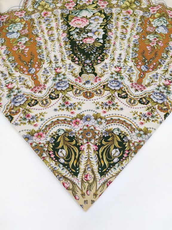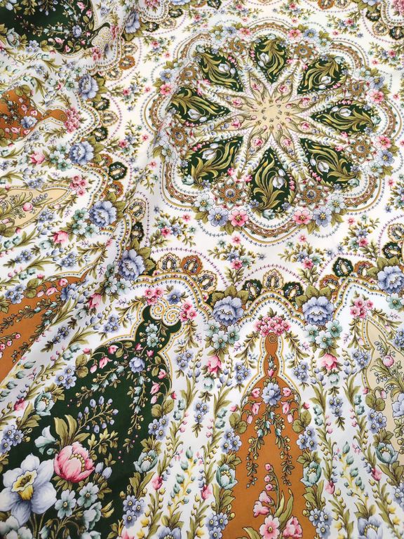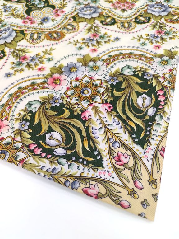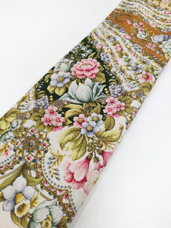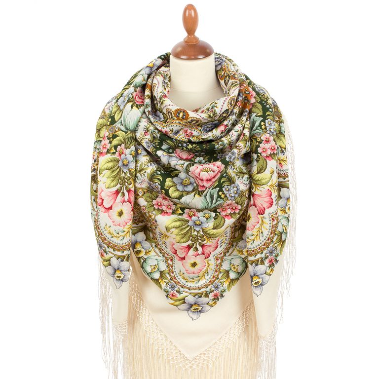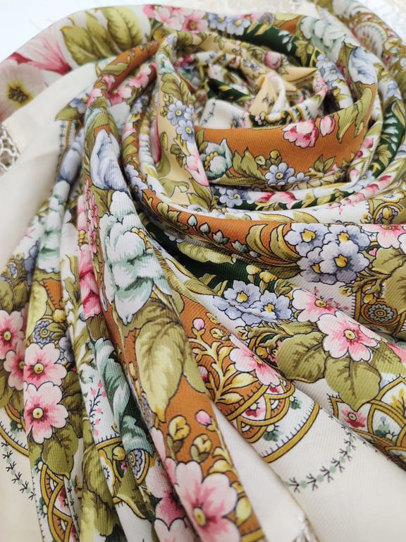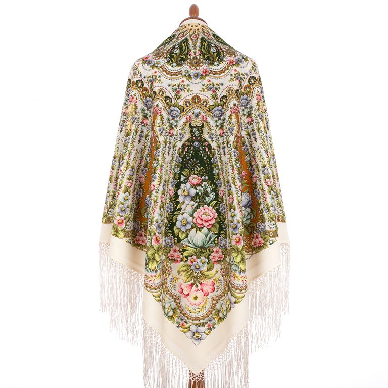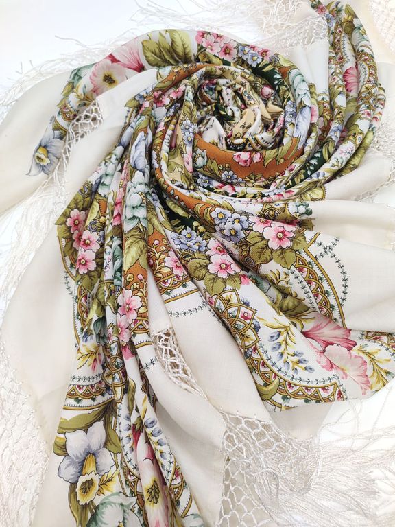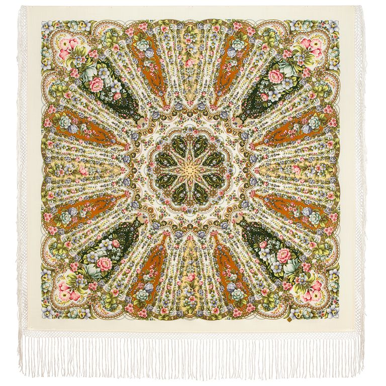 Павловопосадская шерстяная шаль "Половодье чувств" арт 1992-4, с вязаной вручную шелковой бахромой