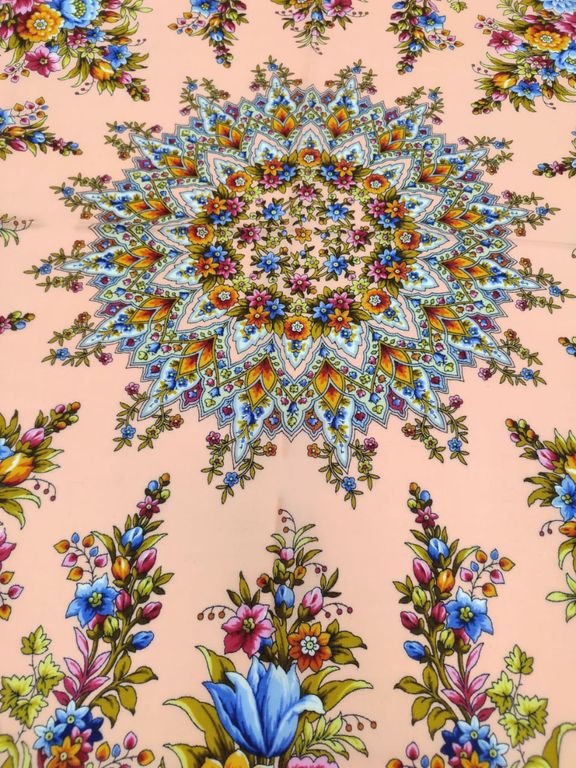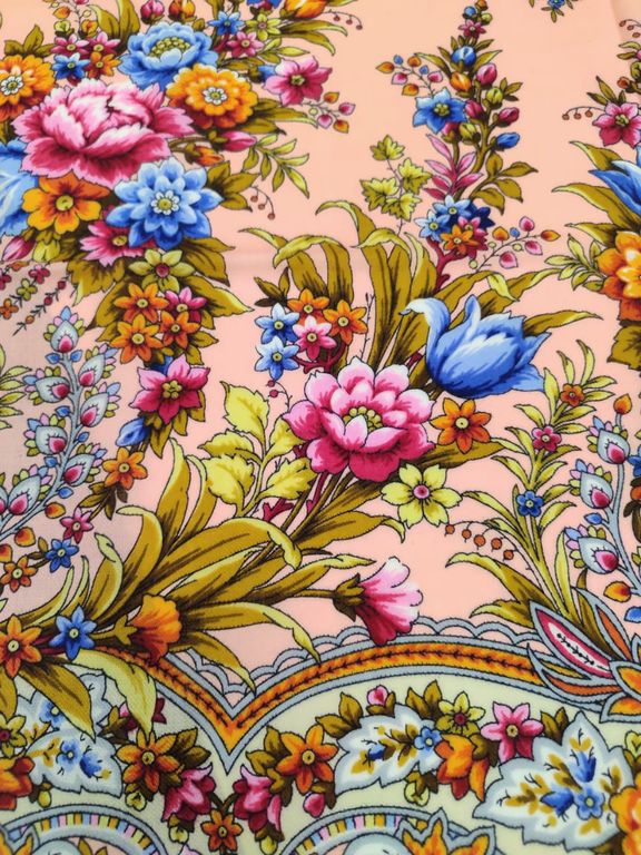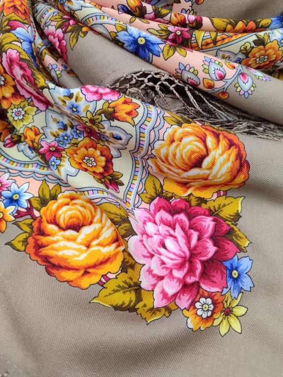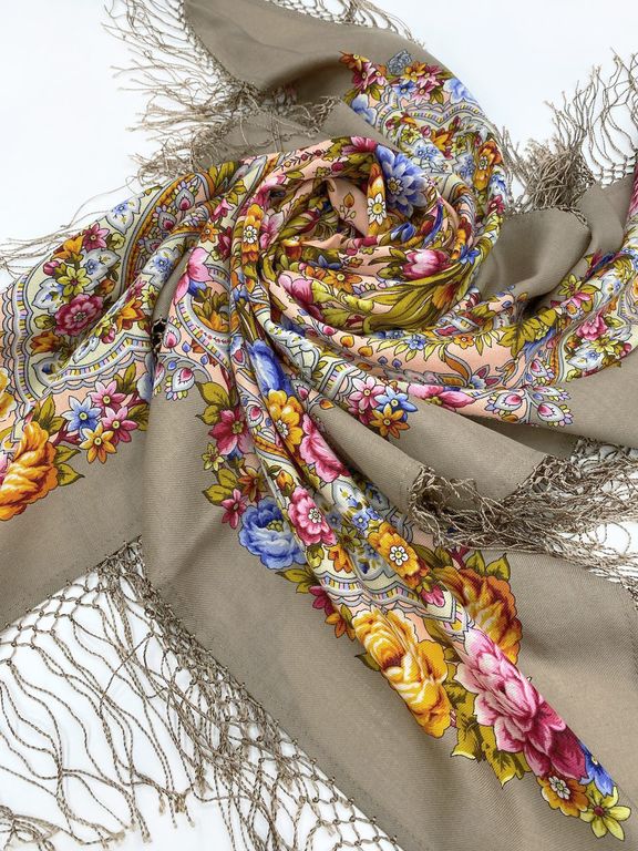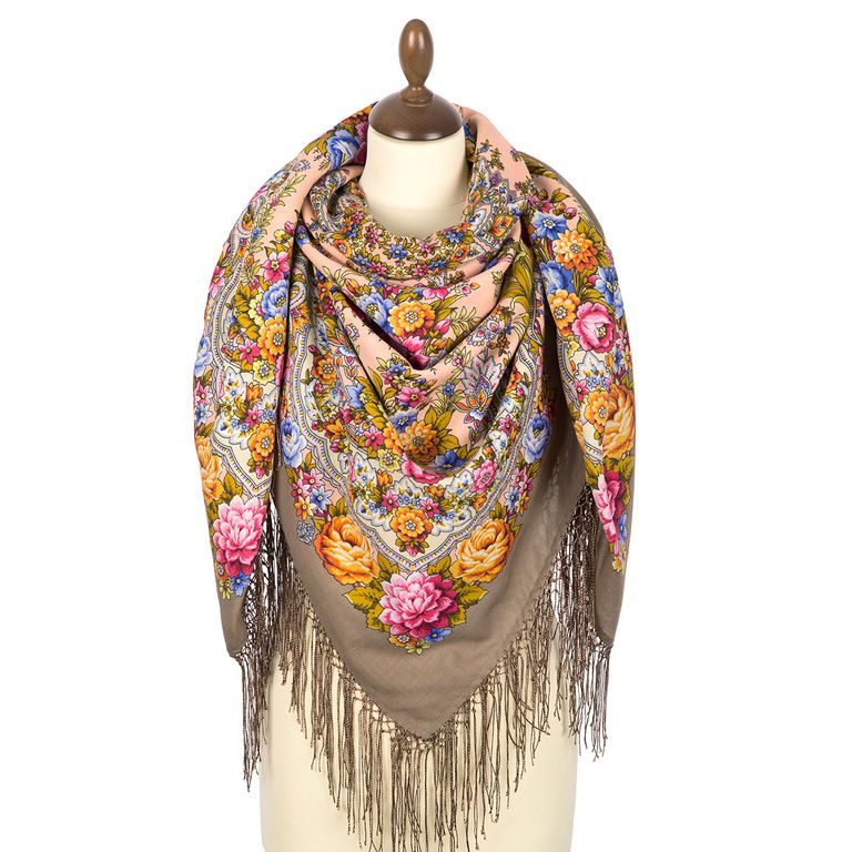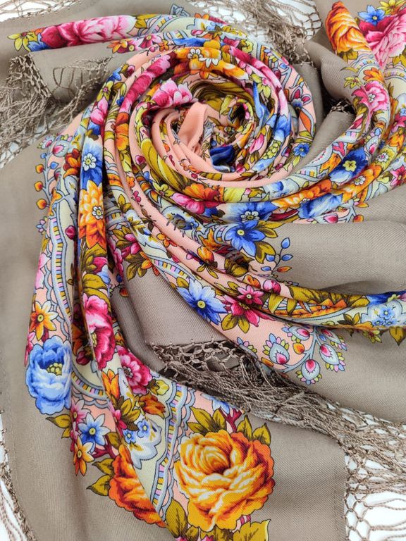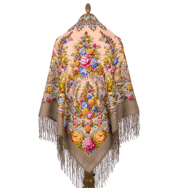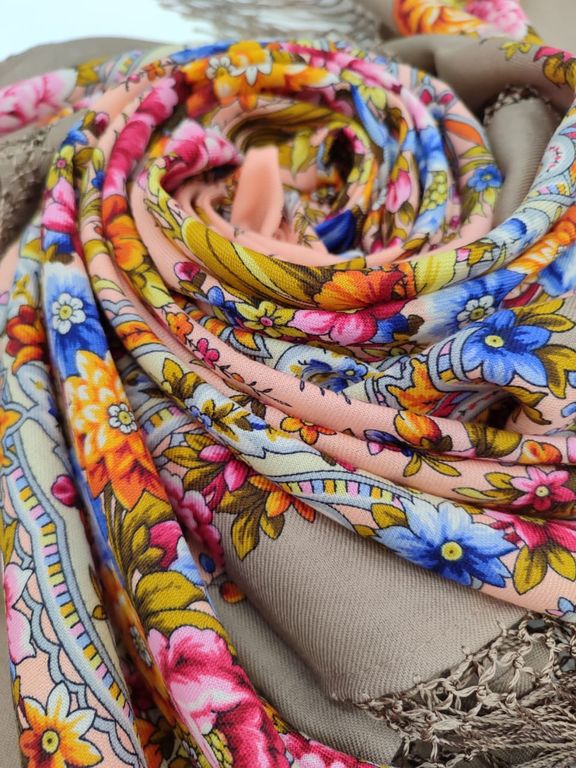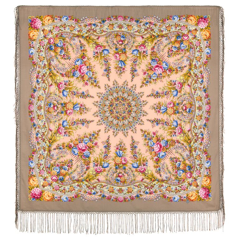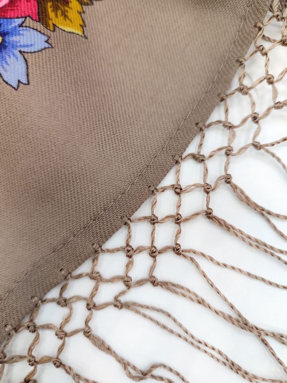 Павловопосадский шерстяной платок с вязаной вручную бахромой " Праздник огня 1739-17