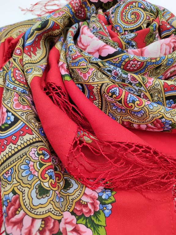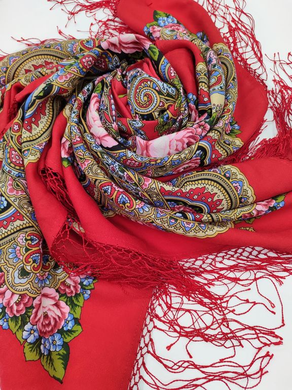 Павловопосадский шерстяной платок с вязаной вручную бахромой "Русское раздолье" арт. 1619-5