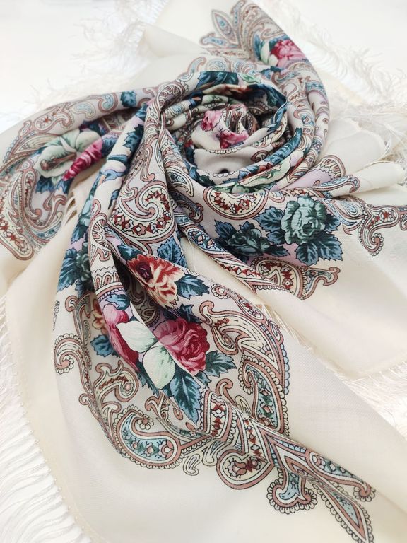 Павловопосадский шерстяной платок с шелковой бахромой "Тайна сердца" 1437-0