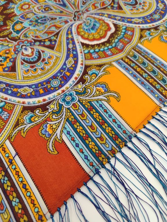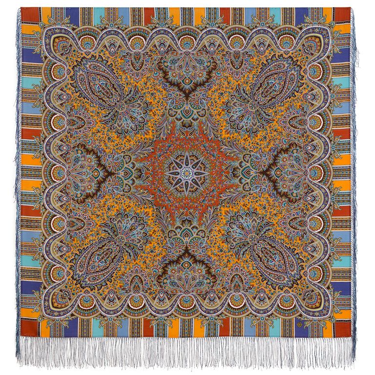 Павловопосадский шерстяной платок "Золотой петушок" арт. 1943-52, с шёлковой бахромой