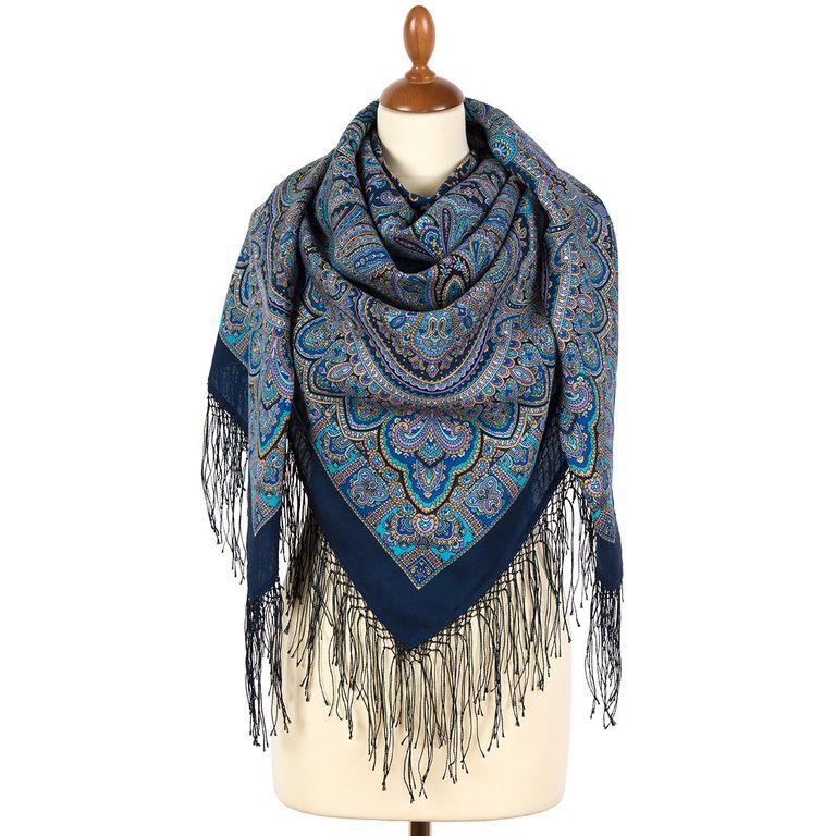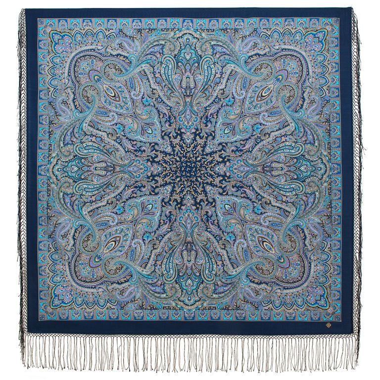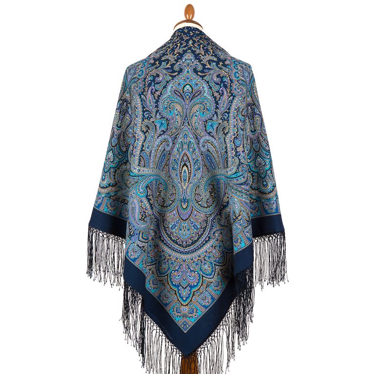 Павловопосадский шерстяной платок "Терем расписной" 1810-14, с вязаной вручную шёлковой бахромой